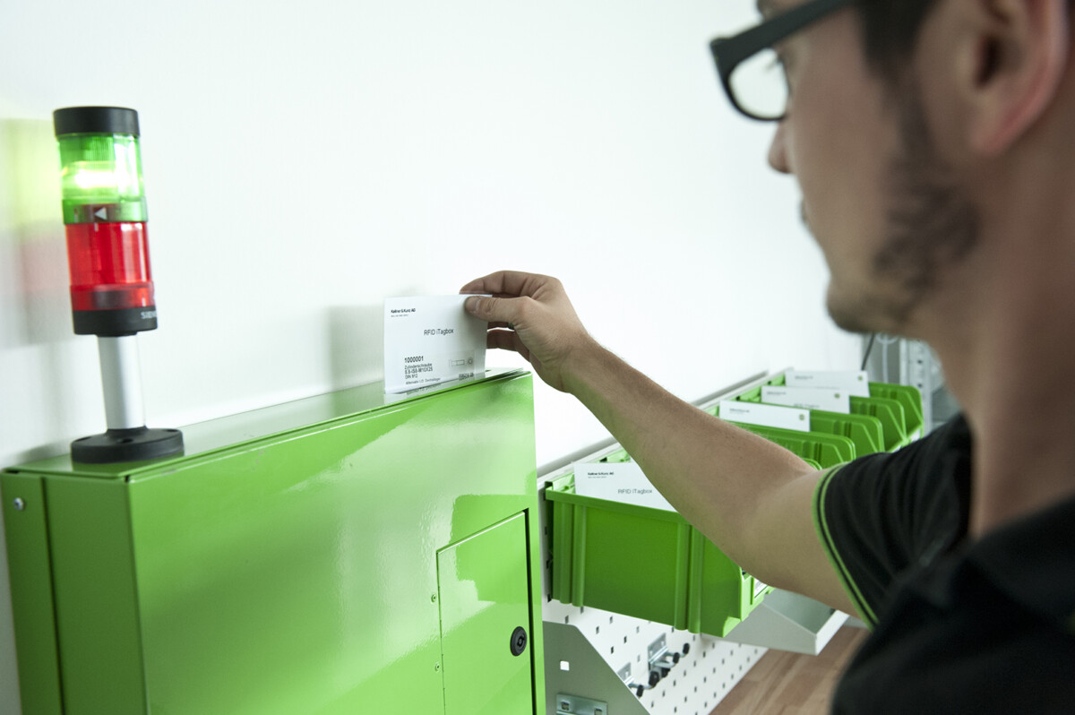 S tehnologijo RFID (radiofrekvenčna identifikacija) Kellner & Kunz odpira nove temelje pri upravljanju zalog – zlasti v sistemu KANBAN. Elektromagnetni valovi omogočajo spletno “pravočasno” zajemanja zahtev za naročilo vaših C-elementov. Jedro je RFID transponder, ki nadomešča prejšnje ročno skeniranje in poroča o porabi in zalogi v realnem času.